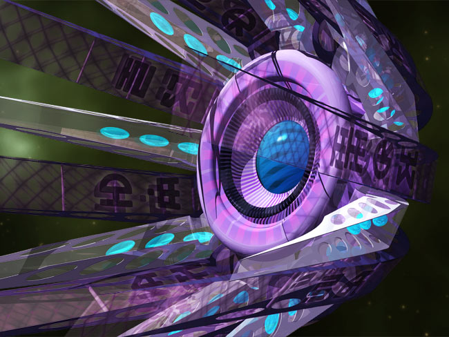 A shuttlecock-like coroot holds an aquamarine pucore in its centre. A neon pink navelipe crowns its tip. A thin black ring floating just above the pucore is called oracling. It is held in situ by a weak electromagnetic field. The coroot has two magnetic grooves. One holds nine silver spikes; the other nine pink-tinted solpans. Each spike contains three aquamarine liquibeans, also called beanbons. The doogmint can be found in a variety of shapes, ranging from a tube to a fully opened star. While the raybeams stay uniform, the solpans widen or narrow since their shape and efficiency is related to their position.