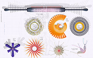 A partial overview of spaceblooms taken from page 126-127 of Spacebloom : A Field Guide to Cosmic Xflora. From the top and left to right: maileus, wirbylet, aciluce, elpae, oofka, fosix, and hagopinis.